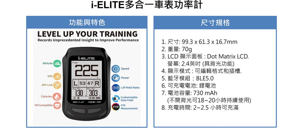 ★ i-ELITE: GPS 自行車車表+踏頻器,適合入門、中階及未擁有車表之騎乘者,簡單享受最新科學化訓練帶來的好處。提供速度、功率輸出或任何騎行數據。